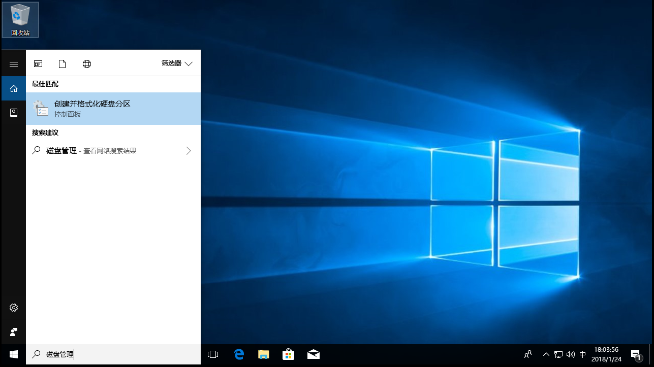 1、点击左下角任务栏的小娜输入框输入“磁盘管理”并选择“创建并格式化硬盘分区”。