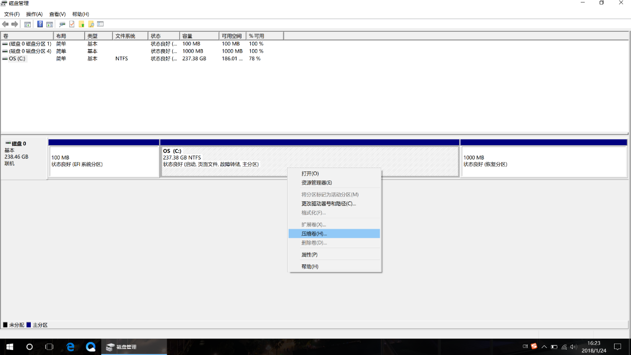 2、鼠标右键点击“OS(C)”,弹出菜单后,点击压缩卷。