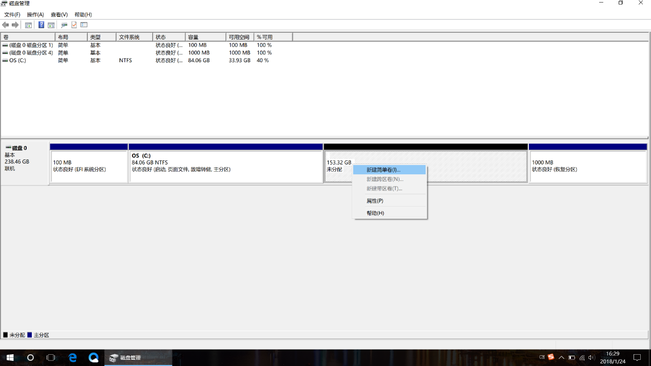 4、压缩成功后,会出现未分配的黑色磁盘条,在此磁盘上鼠标右键“新建简单卷”。
