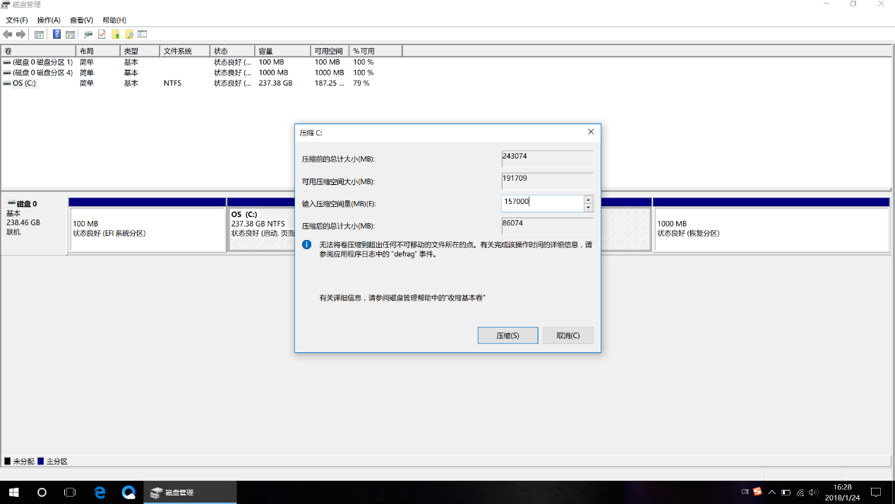 3、输入被分区磁盘的容量大小(C盘“OS”建议保留一定容量),并点击压缩。