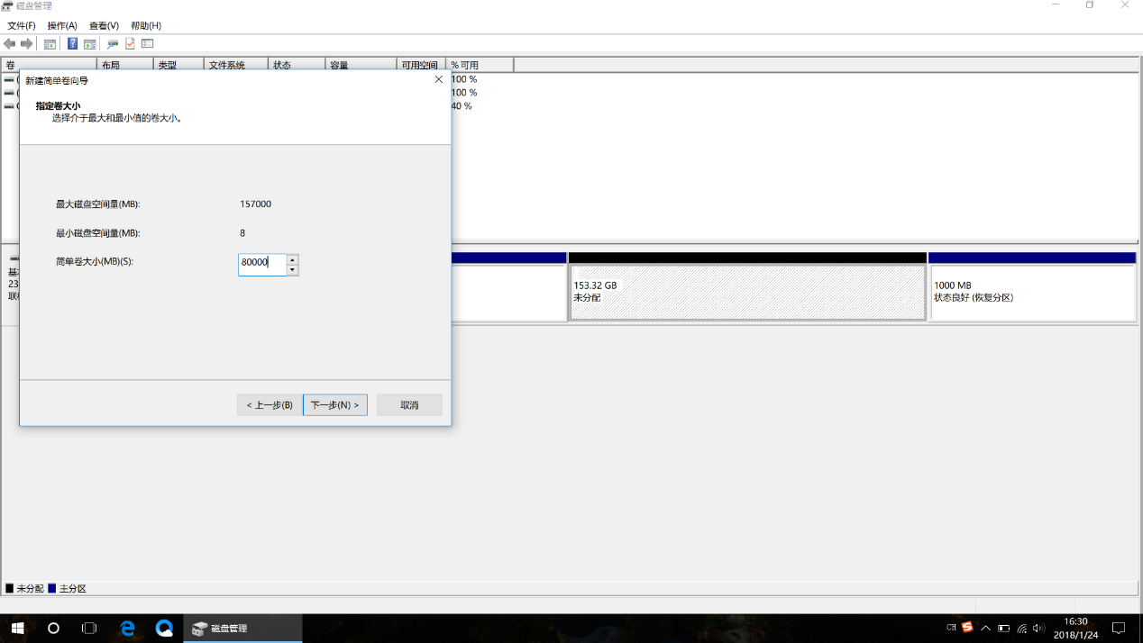 6、输入磁盘D容量点击下一步。如果需要分区多个磁盘请输入小于未分配容量的数值(未分配容量等于其他未分区磁盘容量相加)