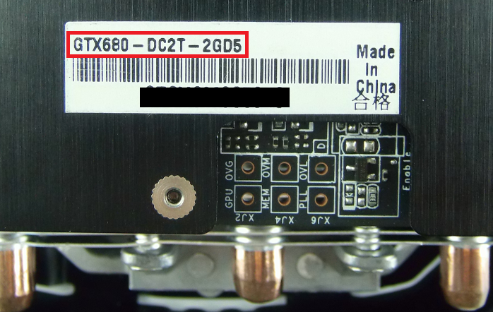 例如:GTX680-DC2T-2GD5 即代表显卡型号